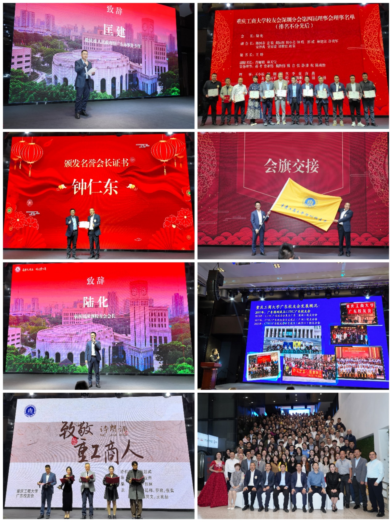 典礼上,田双全为广东校友会第四届理事会会长、副会长颁发聘书,为上届会长、1990级机械制造工艺及设备专业钟仁东校友颁发名誉会长证书,并见证了钟仁东校友与继任会长、1995级法学专业陆化校友的交接会旗。陆化校友作为新任会长登台致谢发言。活动中,校友代表朗诵了由学校校友会副会长、广东校友会创会会长、1989级机械制造及其自动化专业敬廷武校友原创的诗歌“致敬重工商人”,真挚的文字、质朴的感情,承载着广东校友对母校的眷恋、对老师的感谢、对同窗的牵挂,引发了全场校友嘉宾的强烈共鸣,将庆典现场的氛围推向高潮。