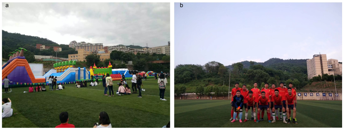 参与学校各种活动(a.学校趣味活动;b.学院足球比赛)